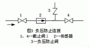 氟塑料襯里傳感器須謹(jǐn)慎地應(yīng)用于負(fù)壓管系;正壓管系應(yīng)防止產(chǎn)生負(fù)壓,例如液體溫度高于室溫的管系,關(guān)閉傳感器上下游截止閥停止運(yùn)行后,流體冷卻收縮會(huì)形成負(fù)壓,應(yīng)在傳感器附近裝負(fù)壓防止閥,如圖3所示。有制造廠(chǎng)規(guī)定PTFE 和PFA 塑料襯里應(yīng)用于負(fù)壓管系的壓力可在200C、1000C、1300C時(shí)使用的絕對(duì)壓力必須分別大于27、40、50KPa。
