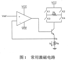 以往的激磁電路的設(shè)計(jì)都是采用恒流源和可控開(kāi)關(guān)電路組成。恒流源是由電壓基準(zhǔn)、比較放大、控制調(diào)整和采樣等部分組成的直流負(fù)反饋?zhàn)詣?dòng)調(diào)節(jié)系統(tǒng),常用的激磁電路就是用串聯(lián)調(diào)整型恒流電源盒控制開(kāi)關(guān)組成的,如圖1。其中Vref是參考電壓,Rs是采樣電阻,Is為流過(guò)Rs的電流,就是所需的恒流,RL為電磁流量傳感器線圈,K1、K2、K3、K4為可控開(kāi)關(guān),以達(dá)到使線圈RL中流經(jīng)正負(fù)交換的電流,對(duì)傳感器激磁。