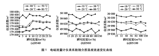 由圖1可得:( 1)隨著介質溫度的升高,給排水流量計的儀表系數均呈逐漸降低的趨勢。其中20℃和50℃的儀表系數基本相同,10℃和80 0C的儀表系數與20℃時偏離較大。(2)溫度對給排水流量計的儀表系數在高溫以及低溫處影響明顯,以D N40給排水流量計為例,儀表系數本次實驗高低溫處*大變化量約為0. 7% o ( 3)在給排水流量計相應的流量范圍內,在同一溫度下,隨著介質流速的變化,給排水流量計的儀表系數在個別點出現略微浮動,但整體變化不超過1 0. 2 %。