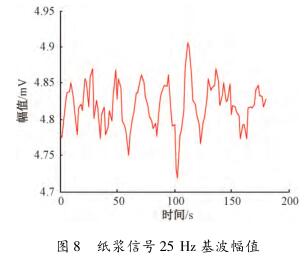 在頻域中對紙漿信號觀察時發現,紙漿信號的漿液噪聲頻帶在零頻率點附近,距離流量信號基波頻率點較遠,對基波幅值和各奇次諧波幅值基本沒有影響,紙漿信號在頻域中的圖形如圖7所示。選擇一組采集的紙漿信號,把其等分成數段,利用MATLAB計算每段數據在基波處的幅值并提取保存在一個數組中,使用繪圖工具畫出來,如圖8所示。可見,基波幅值在4.7~4.95mV變化,波動較小。因此,提取到的與流量相關的感應電動勢信號幅值會比較穩定。