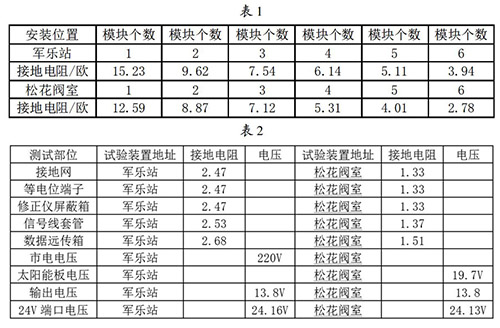 接地網(wǎng)的安裝與連接:接地網(wǎng)是整個(gè)重油流量計(jì)防雷試驗(yàn)比較關(guān)鍵的一個(gè)內(nèi)容,能不能準(zhǔn)確的論證試驗(yàn)的有效性,必須保證接地網(wǎng)達(dá)到標(biāo)準(zhǔn)的接地電阻,通過對實(shí)地地電阻率的測試,初步選擇6個(gè)接地模塊埋設(shè)并配用降阻劑使用,邊安裝邊測試直到達(dá)到標(biāo)準(zhǔn)值后才引入等電位箱。在軍樂站和松花閥室安裝模塊并測試數(shù)據(jù)見表1。