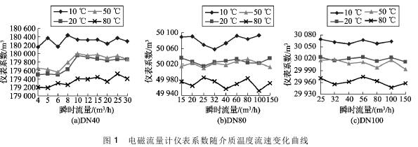 將實(shí)驗(yàn)測得的環(huán)保污水專用流量計(jì)在不同溫度及流速下的儀表系數(shù)數(shù)據(jù)整理,特性曲線如圖1所示,3組曲線分別對應(yīng)DN40、DN80、DN100的3塊環(huán)保污水專用流量計(jì)的儀表系數(shù)曲線。