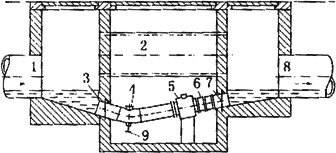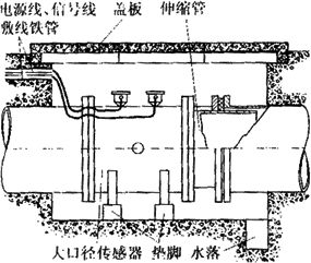 由于大口徑管道在多數場合下是埋在地下的,因此大口徑傳感器在安裝前應做好水泥地坑。圖6-19所示是在給排水系統中常見的安裝形式。水泥地坑應有足夠的活動空間,側壁埋有敷設電纜的鋼管,上有蓋板防止雨淋,下有泄水管以免坑內積水而使傳感器侵水。為了拆裝方便,傳感器應放在墊腳上,且在下游側裝有活絡的伸縮管。圖6-20是熱水流量計在地下水泥管污水排放系統中的安裝實例。