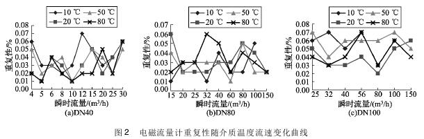 由圖2可得,隨著介質溫度及流速的變化,dn150深井水流量計的重復性有一定的波動,但都在0.07%以下,符合JJG1033-2007《dn150深井水流量計》的重復性要求,說明dn150深井水流量計的重復性受溫度及流速影響較小,同時表明該熱水流量標準裝置在不同溫度點下的測量性能穩定。