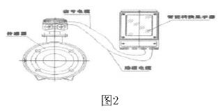 測氨水流量計是由流量傳感器和轉換器(也叫顯示器)兩大部分組成。測量管上下裝有激磁線圈,通激磁電流后產生磁場穿過測量管,一對電極裝在測量管內壁與液體相接觸,引出感應電勢,送到轉換器。激磁電流則由轉換器提供。如圖2所示: