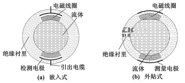 電極與被測流體通過絕緣管形成檢測電容,通過此電容來藕合流量信號。其主要的結構形式按照電極的安裝位置可以分為兩種:電極嵌人測量管的絕緣襯里內部(嵌人式)、電極貼在測量管外部(外貼式)。嵌入式結構與普通工業污水流量計結構相似,而外貼式大多是通過陶瓷表面金屬化技術將電極貼在測量管外。