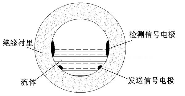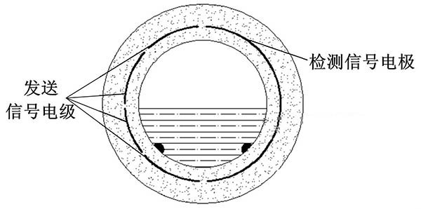 ③利用阻抗或信號衰減研制的非滿管工業污水流量計。這種結構的非滿管工業污水流量計是當前國內研究的方向之一。其結構是流量管底部貼一對信號發射電極,在流量管中間貼信號接收電極。由于信號在流體中傳播會產生衰減,且傳播時間越長,衰減越多,因此通過信號接收電極接收到的信號衰減量即可得知液面高度;同時該電極還能測量流體切割磁感線產生的電動勢,以此達到測量非滿管流量的目的。阻抗式或信號衰減非滿管工業污水流量計結構簡圖如圖5所示。