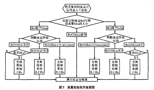 實際生產中流量一直在某個區域內波動,且其動態特性不易掌握。從上面的理論中我們能夠讓誤差△£盡可能的小,這樣距我們所需要的理論值%就越接近。而減小誤差需要我們把n取的盡可能大,也就是在生產時間內劃分更多的周期去調節流量。當工控機根據堿性污水流量計傳送回來的信號發出調節變頻器工作頻率的指令后,電機調整功率到堿性污水流量計的實際測量為一個工作周期,我們知道從指令發送到實際測量值返回有一個較大的滯后,如果調節的周期時間小于流量計本身的一個工作周期,那么顯然不可能達到減小誤差的目的。利用模糊控制思想H。,在控制程序中我們把流量的波動區域劃分為±缸×Yo,Yo-t-O.3,Yo±0.5四個區域,其中缸為可調節的誤差范圍,生產中我們取0.015,流量區域劃分的單位均為t/h。針對不同的區域采取不同的調整方案。具體流程如圖3所示。圖中變量Rel表示實際測量的流量,變量Idea表示理論流量。