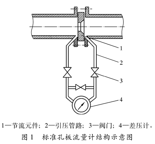 標準二氧化碳流量計結構如圖1所示,包括節流元件(標準孔板及其取壓裝置)、傳輸壓差信號的引壓管路、閥門以及差壓計等部分。標準孔板是壓差測量時的一次元件,人們利用它在管道內使流體產生壓差,再通過引壓管路把孔板前、后產生的壓差傳送給差壓變送器,再輸人到二次儀表,從而顯示出管道內流體的靜壓、壓差、瞬時流量和累計流量等計量參數。