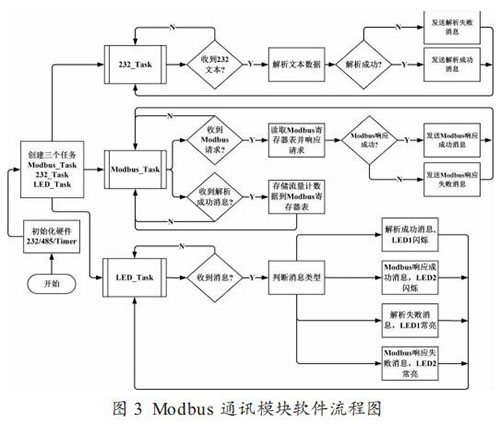 圖 3 為 Modbus 通訊模塊的軟件流程圖,創建的三個任務都是以 FreeRTOS 系統的消息(Message)來驅動。