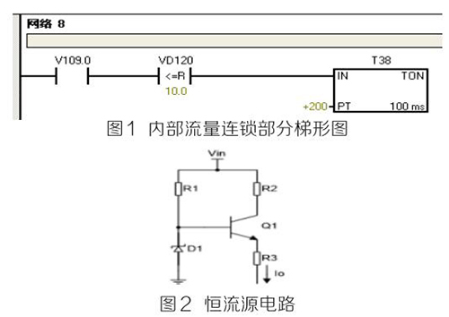 (2)PLC及模塊。PLC及模塊是自動化控制系統主要設備,且PLC及模塊屬于高集成高精密電子設備,保持室內整潔舒適,可以提高自動化系統運行穩定性。PLC及模塊硬件運行可靠,內部控制程序是其控制核心軟件,如PLC硬件出現故障或損壞一般直接更換,但原內部控制軟件無法上傳,整個控制系統成失控狀態。所以其內部控制程序在調試驗收合格后應及時備份并做好標記,為以后修復PLC故障提供保障。PLC系統的維護技術人員需掌握一定基礎PLC控制邏輯原理,對準確判斷PLC故障點有很大的幫助。例如選礦廠水泵房S7-200系列PLC自動抽水系統出現如下故障 :觸摸屏能控制變頻器啟動水泵抽水,但在短時間內會自動停泵,導致無法正常抽水。通過故障現象可初步判斷PLC及模塊硬件設備正常,主要由于某個變量有問題導致連鎖停機。打開備份PLC控制梯形圖程序進行相關分析,原來是水流量計瞬時流量數值做了連鎖,其在一定時間內瞬時流量不大于10m 3 /h時,自動停泵,電磁流量模擬量輸出電流值僅為4ma且無變化,確定水流量計有故障。可臨時應急維修,模擬量模塊輸入模擬電流值10ma~20ma之間一固定數值即可恢復正常運行。制作簡單恒流源電路代替水流量計輸出的模擬電流量,實現解決水泵無法正常運行的故障。