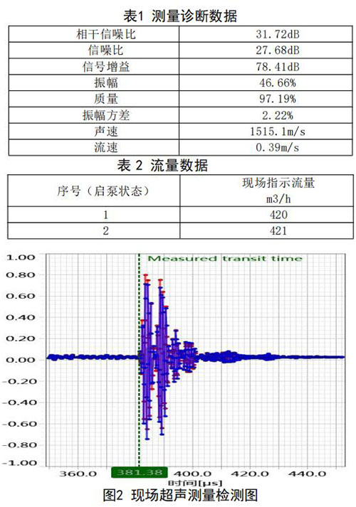 在高負(fù)荷段采用泵送補(bǔ)給水狀態(tài):測試時間 2018年10月11日,采用德國FLUEX高精度外夾式超 聲波流量計作為標(biāo)準(zhǔn)流量計,測量基礎(chǔ)數(shù)據(jù):管道 外徑276.93mm,管壁厚度12.40mm,采用兩聲程169mm傳感器安裝距離,通過對超聲波流量計信號 分析與診斷(數(shù)據(jù)見表1、表2和圖2),診斷數(shù)據(jù) 提示標(biāo)準(zhǔn)超聲波流量計測量狀況佳,檢測開始,啟 動補(bǔ)給水泵,運行一段時間流量穩(wěn)定后,測量結(jié)果 如下: