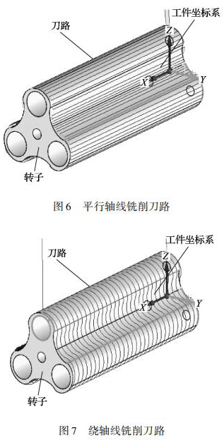 三葉轉(zhuǎn)子的曲面是由多條直線(xiàn)組成的直紋面,加工三葉轉(zhuǎn)子這種高精度的直紋曲面必須采用四軸或五軸聯(lián)動(dòng)的數(shù)控機(jī)床。三葉轉(zhuǎn)子的銑削方式有刀具路徑平行軸線(xiàn)銑削、繞軸線(xiàn)銑削兩種刀具路徑。平行軸線(xiàn)銑削原理為: 刀具在轉(zhuǎn)子曲面上沿 X軸從轉(zhuǎn)子的一端移動(dòng)到另一端銑出一條直線(xiàn),銑削下一點(diǎn)位時(shí)旋轉(zhuǎn) A 軸 Z 軸聯(lián)動(dòng)再次從轉(zhuǎn)子一端銑削到另一端,采用往復(fù)銑削直到完成整個(gè)轉(zhuǎn)子曲面,刀具路徑如圖 6 所示。繞軸線(xiàn)銑削原理為: 刀具在轉(zhuǎn)子曲面上 AZ 軸聯(lián)動(dòng)刀具繞 A 軸軸線(xiàn)銑削,銑削下一點(diǎn)位時(shí)移動(dòng) X 軸,再次 AZ 軸進(jìn)行聯(lián)動(dòng)銑削,采用往復(fù)銑削直到完成整個(gè)轉(zhuǎn)子曲面,刀具路徑如圖 7 所示。由于繞軸銑削需要 AZ 軸聯(lián)動(dòng)切削,而數(shù)控機(jī)床可以達(dá)到的進(jìn)給率是由*慢的軸決定的,所以,這種刀具路徑在精加工高速銑削時(shí)并不適用。