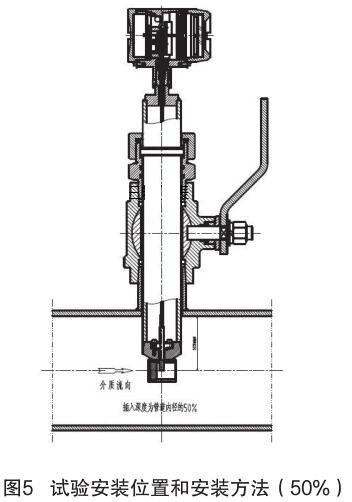 對插入式壓縮空氣流量計和插入式電磁流量計的結構原理進行分析,插入式電磁流量計的信號采集點在標校管道內12.5% 為宜,因它屬電磁類流量計,而壓縮空氣流量計是根據“卡門渦街”原理進行測量管道內流量,根據標校管道內層流和湍流的分析,以及插入式壓縮空氣流量計獨特的探頭結構形式,確定插入式壓縮空氣流量計的插入深度為標校管道內 50%,試驗安裝位置和安裝方法如圖 5 所示。