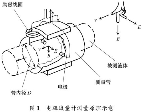 防腐型電磁流量計(jì)的測量原理如圖 1 所示。根據(jù)法拉*電磁感應(yīng)定律,導(dǎo)電液體在磁場中流動(dòng)會(huì)產(chǎn)生電動(dòng)勢 E,它與磁感應(yīng)強(qiáng)度 B、導(dǎo)電液體平均流速 v 成一定比例關(guān)系: