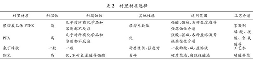 防腐型電磁流量計(jì)要根據(jù)被測流體的溫度、壓力、速度以及含固顆粒的硬度、含量和粒徑大小來決定測量管內(nèi)襯的材質(zhì)。該濕法磷酸裝置中,防腐型電磁流量計(jì)測量管襯里材質(zhì)的種類見表 2。