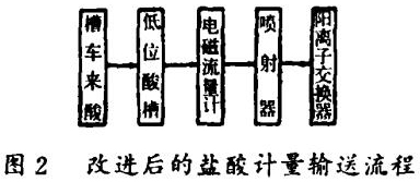 該系統(tǒng)工藝復雜,操作困難,安全性低,在一次向高位酸槽壓送濃鹽酸的過程中,曾發(fā)生過鹽酸噴出傷人的事故。因此對整個系統(tǒng)進行了改進(見圖2)