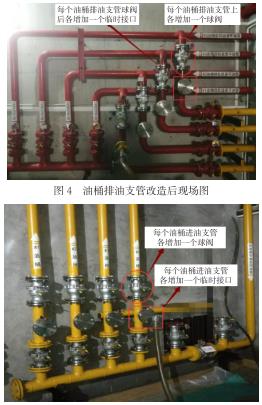 (3)改造后,油庫中各個(gè)油桶的透平油在處理過程中,發(fā)生竄油至機(jī)組透平油供油、回油總管和各臺(tái)機(jī)機(jī)組段供排油管網(wǎng)的概率大大降低,保證其他非檢修機(jī)組及運(yùn)行設(shè)備的安全。改造前,進(jìn)行油處理時(shí)油流必須流經(jīng)油處理室中的機(jī)組透平油供油和回油總管,而油處理室中的機(jī)組透平油供油和回油總管與縱貫全廠的機(jī)組供、排油兩根干管僅有一個(gè)球閥進(jìn)行截止,該閥門如果操作失誤未關(guān)閉或關(guān)閉不嚴(yán)密等異常情況,必然造成竄油至機(jī)組透平油供油、回油總管和各臺(tái)機(jī)機(jī)組段供排油管網(wǎng),引發(fā)不安全事件。改造后,進(jìn)行油處理時(shí),油流僅流經(jīng)支管,支管和總管之間有一個(gè)球閥截止,總管與干管還有一個(gè)球閥截止,多了一道防護(hù),極大提高了設(shè)備的可靠性。
