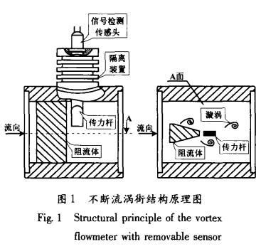 不斷流渦街同樣是以卡門(mén)渦街原理為依據(jù)測(cè)量流體流速的,但不斷流渦街表體已經(jīng)在結(jié)構(gòu)上有了質(zhì)的改變。如圖1所示,它將普通渦街單一的信號(hào)檢測(cè)傳感頭改變?yōu)閭髁U與信號(hào)檢測(cè)傳感頭兩部分,并通過(guò)隔離裝置完全隔離。當(dāng)表體中流過(guò)流體并產(chǎn)生漩渦時(shí),由傳力桿檢測(cè)漩渦的變化,并以力的形式傳遞給信號(hào)檢測(cè)傳感頭,完成了力信號(hào)到電信號(hào)的轉(zhuǎn)換過(guò)程。雖然傳力桿與流體直接接觸,但其本身只是進(jìn)行力傳輸?shù)母軛U,因此,只對(duì)外形尺寸及鋼材選擇上具有要求。而信號(hào)檢測(cè)傳感頭是通過(guò)隔離裝置與流體完全密閉隔離的,再加上隔離裝置本身具有的散熱功能,使得信號(hào)檢測(cè)傳感頭的使用溫度要遠(yuǎn)遠(yuǎn)低于流體的實(shí)際溫度,從而有效地提高了普通信號(hào)檢測(cè)傳感頭的可測(cè)介質(zhì)溫度。同時(shí),不斷流渦街在進(jìn)行維修更換信號(hào)檢測(cè)傳感頭時(shí),并不影響工藝管道內(nèi)流體的流動(dòng),真正實(shí)現(xiàn)了信號(hào)檢測(cè)傳感頭的不斷流拆裝維護(hù)。