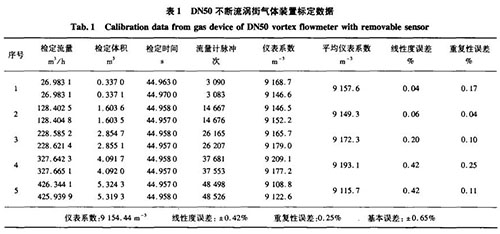 在實(shí)際標(biāo)定過(guò)程中,相同口徑的不斷流渦街與普通管道煤氣流量計(jì)在可測(cè)流量范圍、基本誤差、重復(fù)性等參數(shù)上基本一致,達(dá)到了設(shè)計(jì)和使用精度的要求。