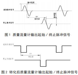 將插入式電磁流量計(jì)流量與相關(guān)測(cè)試設(shè)備連接起來(lái),就可以進(jìn)行插入式電磁流量計(jì)的校準(zhǔn),時(shí)間差△ t 由專(zhuān)用試驗(yàn)測(cè)試設(shè)備可以測(cè)出。起始脈沖信號(hào)和終止脈沖信號(hào)如圖 1 所示。經(jīng)過(guò)專(zhuān)用試驗(yàn)測(cè)試設(shè)備信號(hào)轉(zhuǎn)化后的信號(hào)方波如圖 2 所示。