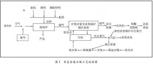 在有色金屬冶煉過程中,將原料、燃料和輔助材料根據(jù)熱平衡原理按一定比例進行配料,配料后的物料與空氣或高含氧的混合空氣在熔煉爐中進行氧化或還原反應,熔煉出有色金屬產(chǎn)品。同時,在熔煉過程中會產(chǎn)生大量的高溫煙氣( 1200 ℃ 左右),高溫煙氣經(jīng)過余熱鍋爐時,與余熱鍋爐水側的軟化水進行熱量交換,煙溫迅速降至 250℃ 以下,再經(jīng)收塵、制酸或脫硫裝置進一步收塵、降溫、凈化,*終達標排放。余熱鍋爐水側的軟化水經(jīng)熱量交換后產(chǎn)生中壓飽和蒸汽(4 MPa 左右),送至余熱發(fā)電機組發(fā)電。具體的工藝流程如圖 1 所示。
