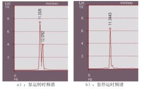 對振動采集器獲取的信號進(jìn)行譜分析,超聲波污水流量計(jì)組運(yùn)轉(zhuǎn)狀態(tài)下主要振動頻率為11.33Hz和12.38Hz,其中12.38Hz為液體流量計(jì)轉(zhuǎn)動頻率;停運(yùn)時,12.38Hz的液體流量計(jì)轉(zhuǎn)頻消失,11.33Hz的外部激擾力依然存在。