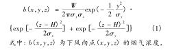 式中: b(x,y,z) = w × e(x,y,z),其中 e(x,y,z) 為二氧化硫濃度與循環(huán)流化床火炬氣流量計(jì)煙氣排放源煙氣強(qiáng)度的比例系數(shù);f 為平均風(fēng)速,m/s; w 為地面空氣內(nèi)煙氣排放強(qiáng)度;σ x 為橫向擴(kuò)散系數(shù)受環(huán)境穩(wěn)定度與下風(fēng)向距離因素的影響程度。式(3)中描述的是基于時(shí)間變化的循環(huán)流化床火炬氣流量計(jì)煙氣排放源煙氣排放強(qiáng)度計(jì)算模型。