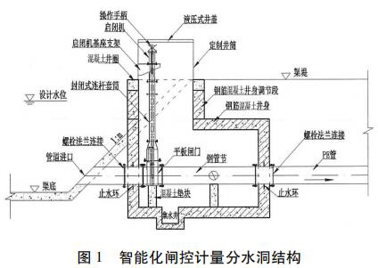 分水洞采用了一種封閉式啟閉閘集成閘井預制件,包括頂節、標準節和底座。與傳統現場澆筑的方式相比,集成閘井采用防水設計,并且安裝更加方便快捷,很大程度上提高了安裝效率,節約成本。采用事先預制好的啟閉閘支座、啟閉機機座,保證了設備的安裝精度,提高了設備運行的穩定性,減少了設備的后期維護。分水洞結構除了預制混凝土外,還可考慮采用玻璃鋼或工程塑料整體制作,用標準節調節高度。分水洞結構設計見圖 1。