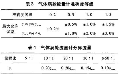 在GB21391--2008《用天然氣渦輪流量計(jì)測(cè)量天然氣流量》對(duì)分界流量q,有明確的定義,即低于該流量要采用擴(kuò)展誤差限的流量值。標(biāo)準(zhǔn)*5.2條從*大允許誤差和量程比兩方面對(duì)分界流量做出了規(guī)定,且明確了量程比是在*大允許誤差范圍內(nèi)流量計(jì)的*小流量和*大流量之比。該標(biāo)準(zhǔn)中對(duì)渦輪流量計(jì)要求的*大允許誤差如表1所示,量程比與分界流量q,的關(guān)系如表2所示。