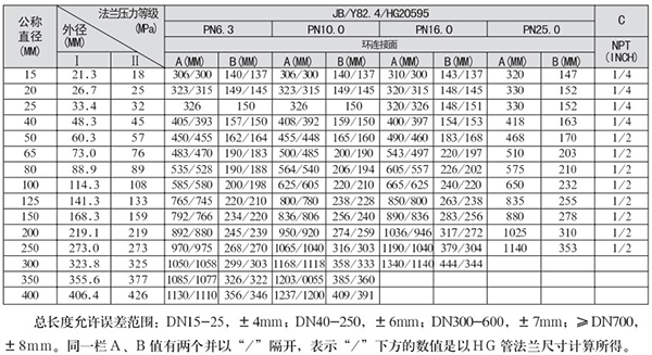 2.尺寸表中同一欄值有兩個并以/隔開,表示/下方的數值是以HG管法蘭尺寸計算所得。