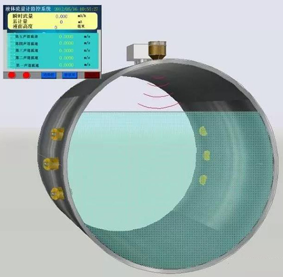 超聲波流量計的工作原理是,借助時差式測量原理,通過一對超聲波探頭發射信號穿過中間介質到達另一側管壁,被另一個探頭接收到,另一側探頭同樣發射信號被*一個探頭接收到。在這個過程中,由于信號的輸送時間受介質流速的影響,所以,存在一定的時間差?;诖耍暡髁坑嫿柚嚓P公式計算出了相應的流量值。