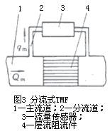 為了獲得良好的線形輸出,必須保持層流流動,測量管內徑d設計得很小而長度l很長,即有很大l/d比值,流速低,流量小。為擴大儀表流量,還可采用在管道內裝管束等層流阻流件;擴大更大流量和口徑還常采用分流方式,在主管道內裝層流阻流件(見圖3)以恒定比值分流部分流體到流量傳感部件。有些型號儀表也有用文丘里噴嘴等代替層流阻流件。