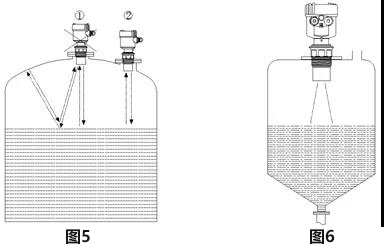 6、對于頂部為平面的錐形容器,四線制超聲波液位計應盡量安裝在頂部中央,這樣可以保證測量到容器底部,如圖6所示。