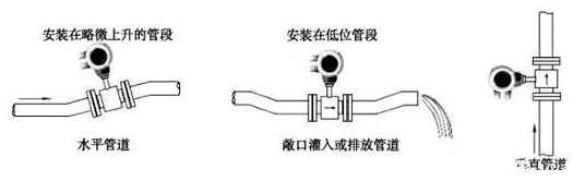 選擇充滿液體的直管段,如管路的垂直段(流向由下向上為宜)或充滿液體的水平管道(整個管路中*低處為宜),在安裝與測量過程中,不得出現(xiàn)非滿管情況。