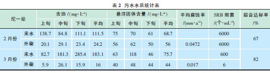 2011年2月坨一站來水含油平均183.1mg/L,外輸含油平均16mg/L,懸浮固體平均8.3mg/L,平均腐蝕率0.017mm/a,SRB 細菌平均6個/mL。只有懸浮固體含量超標。