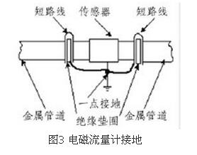 由于一體式污水流量計(jì)價(jià)格的測(cè)量感應(yīng)電壓很小,電壓較低,易受外界電磁噪聲的影響,故在安裝時(shí)應(yīng)進(jìn)行可靠的接地連(跨)接。金屬管道一體式污水流量計(jì)價(jià)格接地連(跨)接方法如圖3所示。