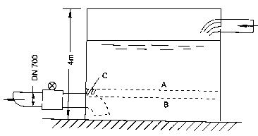 案例4 廣西某水廠在郊區山頭設置清水池,利用水池高度勢能發送成品水。運行人員反映計量出水量的DN700mm酸堿污水流量計有時候流量顯示不穩。晃動達百分之十幾到百分之二十,誤差也大,估計相差約20%。現場考查發現水池如圖7-9所示安裝流量傳感器,水位高度不足就會卷入氣泡,甚至流量傳感器測量管內不能充滿。如水位降至A線時,雖高出吸入口頂端,但高出不多,還會在C處產生旋渦,將水位表面空氣卷入形成氣泡,使顯示晃動;若水位降到B,測量管將不滿管。我們建議如圖虛線所示裝一彎頭,擴大水池有效容量,減少吸入氣泡的機會,彌補原設計的不足。這類實例是經常遇到的。